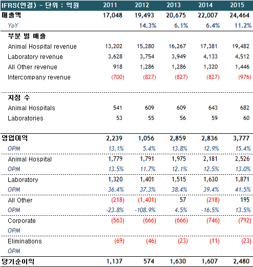<자체제작, 출처 : VCA Inc 사업보고서, 환율 $1 = 1,148원>