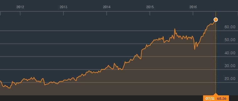 (2016. 07.11(월) 종가의 VCA Inc 주가차트(5년))