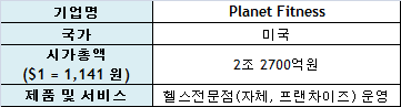 - Planet Fitness - 북미지역에서 프랜차이즈 형태의 대형 헬스장 운영