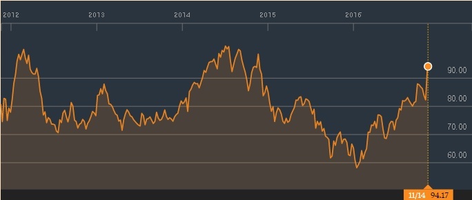 [16.11.14(월) 종가의 Caterpillar 주가차트(5년)]