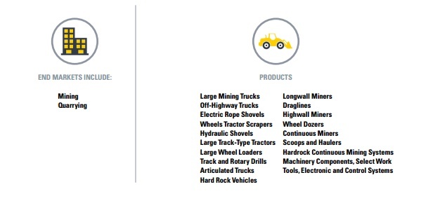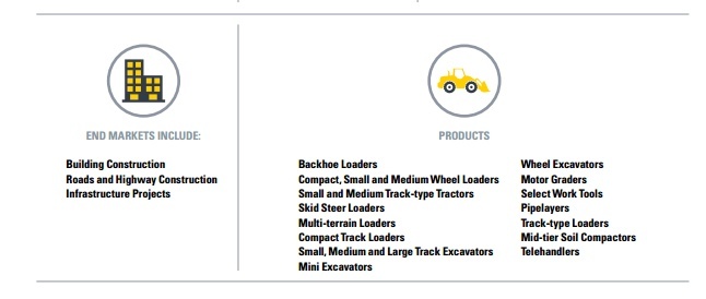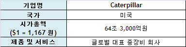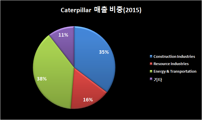 Caterpillar는 글로벌 대표 중장비 생산기업으로서, 현재 건설, 토목에 사용되는 중장비를 생산하는 Construction Industries 사업부와(매출 비중 35%), 구리, 철광석, 석탄 등 원자재 산업에 사용되는 중장비를 생산하는 Resource Industries 사업부와(매출 비중 16%), 에너지 산업에 사용되는 중장비를 생산하는 Energy & Transportation 사업부(매출 비중 38%)로 구성되어 있습니다.