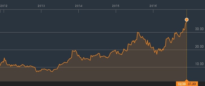 [16.11.23(수) 종가의 Nutrisystem Inc 주가차트(5년)]