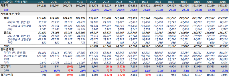 - 세그먼트 별 매출 비중(3Q16)-전자상거래(71%), 미디어(18%), AWS(10%)
