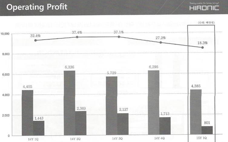 2015년 1분기 매출액과 영업이익을 보면 전년동기 대비 감소했음을 알 수 있습니다. 그 이유는 2014년 4분기에 인력충원이 많이 되어서 인건비만 25억이 1분기에 반영되었고, 1분기에 종속회사가 설립됨에 따라 매출 반영은 없이 비용만 발생하였기 때문입니다.