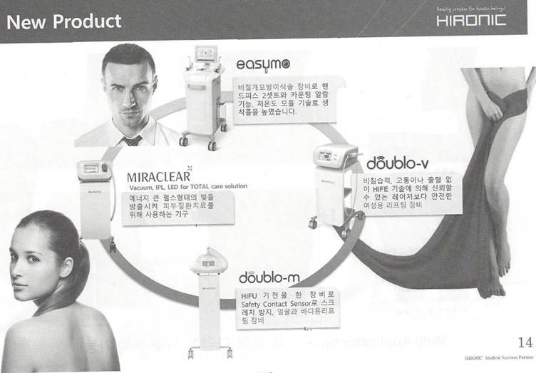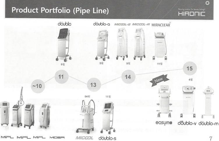 신제품 Easymo는 비절개모발이식술 장비로서 대표적인 이스라엘 장비보다 시술시간은 절반으로 줄일 수 있고, 비절개 방식으로 모발 생착율을 더 높힐 수 있다고 합니다. MIRACLEAR는 일명 여드름 치료기기라고 할 수 있는 피부질환치료 기구입니다. double-m은 기존 더블로 제품보다 더 소형화 시켜 만든 제품이고 double-v는 여성 전용 리프팅 장비입니다. MIRACLEAR는 2014년 11월, 나머지 신제품은 2015년 4월 출시되었는데 모두 KFDA의 수출향 인증을 받아서 바로 수출이 가능하지만 현재 보다 좋은 조건에 수출하기 위해 조율 중이라고 합니다.