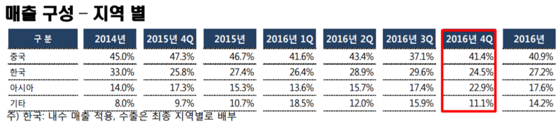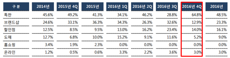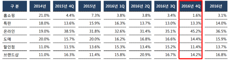 중국의 경우 온라인채널 비중이 점점증가함에 따라 이익성 개선이 되었다. (15년 온라인비중 31.8% -> 16년 36.5%)