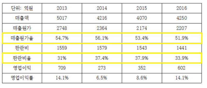 - 16년 3분기를 끝으로 당사의 3여년에 걸친 구조정은 확실히 끝났으며 이는 당장 16년 연간 실적에서 바로 엿볼수 있다.14년,15년에 비해 작년 매출 원가율, 판관비율 모두 개선되었으며, 이에 따라 영업이익률 역시 2013년 수준으로 회복 하였다.