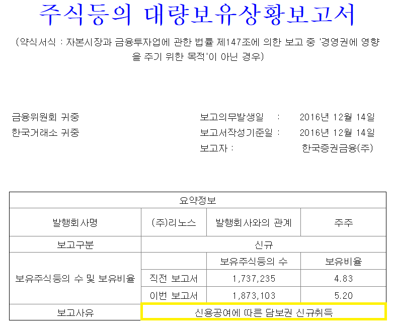 A: 그 회사의 직접 투자가아닌 개인들의 신용거래량이 많아지면서 각 증권사의 일부 물량이 한국증권금융으로 넘어가면서 자연스럽게 지분이 많아져 자동으로 공시가 된 것이다. (그동안 회사가 시베리아 횡단철도, 국가재난망, 바이오 등 다양한 모멘텀 테마에 엮여 개인들의 관심이 일시적으로 커진 때가 빈번했다.)