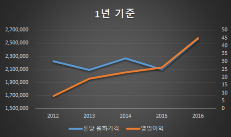 위를 통해 알수 있듯이 2012년 부터 2015년까지 아연가격은 일정한 가격대에서 상승, 하락을 반복하며, 보합세를 유지한 반면, 영업이익은 2012년부터 5년연속 꾸준히 상승하였다. 이는 당사의 이익에 가장 큰 영향을 미치는 아연가격과 상관 없이 이익성 개선을 위한 내부적인 체질 개선이 이루어졌던 것으로 추측된다. 특히 16년 아연가격이 거의 두배로 오르면서 당사의 영업이익 또한 이와 비례하여 크게 증가하였다.