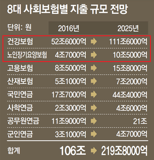 대한민국의 고령화가 매우 빠르게 진행됨에 따라 정부가 이를 부담하는 비용 또한 매우 빠르게 증가하고 있습니다. 노인이 늘어나면 필연적으로 의료비 지출이 증가함에 따라 현재 2016년 건강보험의 지출 비용이 52조 6,000억에서 2025년에는 111조 6,000억으로, 노인장기요양보험은 2016년 4조 7,000억에서 2025년 10조 5,000억으로 크게 증가할 것으로 예상되고 있습니다.