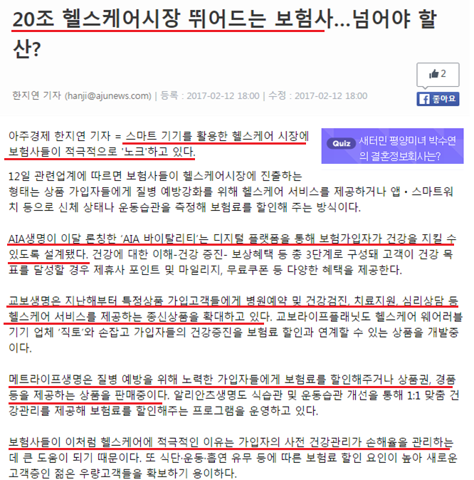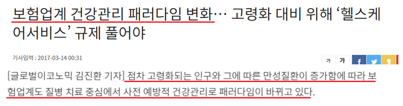 그래서 최근 많은 주목을 받는 것은 바로 의료비 부담을 줄여주는 비즈니스 입니다. 과거에는 의료에 있어서 가장 중요한 것은 치료였지만, 이제는 치료보다는 예방 및 관리에 주목하고 있습니다. 특히나 모바일 및 스마트 기기의 발전으로 인해서 생체 정보에 대한 데이터 전환이 빠르게 진행됨에 따라 이를 가지고 의료의 예방 및 관리가 좀 더 쉽고, 간편하게 이루어지고 있습니다. 앞으로 고령화를 겪고 있는 글로벌 많은 국가 및 각 국가의 보험회사들은 고령화에 따른 자신들의 의료 비용 부담을 줄이기 위해서 최대한 건강에 대한 예방 및 관리를 도와주는 비즈니스에 대한 직접적인 지원 및 도입에 적극적으로 나설 것으로 기대되고 있습니다.