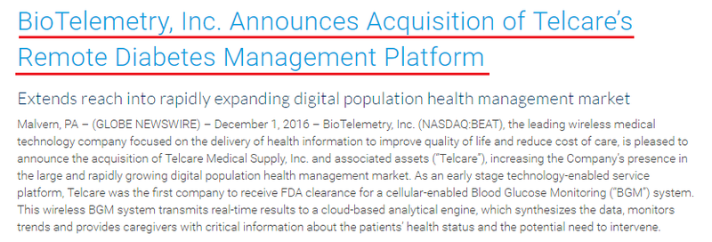 지난 2016년 12월, BioTelemetry Inc는 원격 당뇨병 관리 플랫폼을 운영하는 Telcare의 사업부분을 인수했습니다. 이는 앞으로 BioTelemetry Inc는 현재 강점을 가진 심혈관 진단기기에서 지속적으로 품목을 확대해나가는 동시에 진단에 국한되지 않고, 관리 및 처방까지 제공하는 종합 헬스케어 기업으로 나아가려는 시도를 가진 것으로 보입니다. 투자자로서 아직 BioTelemetry Inc의 미래에 대한 목표가 실행될 수 있을 지는 확실하지 않지만, 한 가지 확실한 것은 BioTelemetry는 많은 심혈관 관련 데이터를 보유하고 있는 것입니다. AI시대를 맞이하여, 데이터를 보유한 기업에게는 분명 많은 기회가 생길 것으로 생각되는 바 앞으로 BioTelemetry Inc에게는 분명 데이터의 가치를 인정받는 계기가 생길 것으로 생각됩니다. 앞으로 BioTelemetry Inc의 앞 날이 기대됩니다.