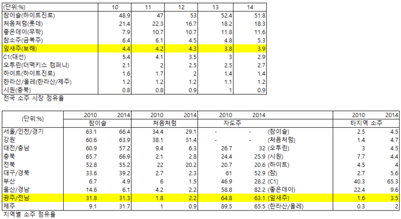 과거 잎새주의 전남, 광주점유율은 85~90%이였으나, 창해에탄올이 보해양조 경영권 인수 당시(2011년) 과중한 채무로 다른 기업의 영업에 적극 대응하지 못해 점유율이 60%대로 하락했다. 특히 저도화 소주 트렌드에 대응하지 못하며, 젊은층의 이탈로 MS하락이 두드러졌다. 젊은 사람 100이면 100... 잎새주(오리지날)을 즐겨 마실 수 있는 사람은 없다. 잎새주는 좀 술이 힘들긴 하다. 다들 저도수를 만들어서 팔았는데, 왜 보해양조는 저도수를 안만들고 잎새주를 주구장창 팔았는지.....