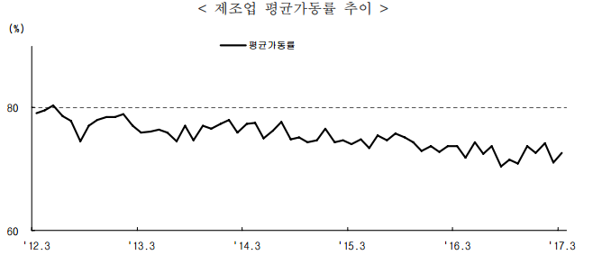 제조업 생산이 최근 살아나는 기미가 보이고 있지만, 2012~2013년에 비해서는 여전히 둔화된 모습입니다. 2014년 국제유가 하락으로 세계경제가 다시금 침체에 빠진 여파가 남아있는 것이죠. 제조업 평균 가동률은 72.6%로 한창때의 80%에 미달하는 모습입니다. 최근 반등하려는 기미를 보이려는 게 그나마 위안거리이죠.