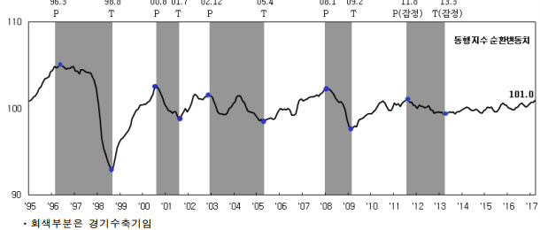 선행종합지수 순환변동치는 2016년 초 바닥을 찍었으나 차츰 회복되고 있는 모습을 볼 수 있습니다.