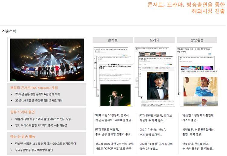 마지막으로 매니지먼트 사업입니다. 배우군과 가수군으로 나누어 매니지먼트 활동을 하고 있으며 2014년까지는 정용화와 이홍기에 의존한 면이 컸습니다. 최근에는 설현, 초아, AOA 등이 광고 시장에서 블루칩으로 성황 중에 있고 이다해, 이동건, 윤진서 등의 배우진들과 이국주, 송은이 등의 예능인들로 활동 영역을 넓혀가고 있습니다.