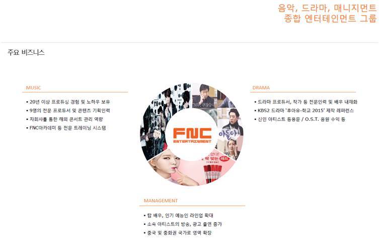 에프엔씨엔터(173940)는 FT아일랜드와 CNBLUE 등을 데뷔시켜 유명해진 엔터테인먼트 회사입니다. 처음 FT아일랜드와 CNBLUE를 국내와 일본에 데뷔시켜 빠르게 성공하였고 이들이 일본에서 라이브 콘서트를 하면서 매출액이 급속도로 성장하였습니다. 2014년부터는 다수의 배우들과 전속계약을 체결하고 2015년에 활발히 작품 출연을 해나가고 있습니다. 최근에는 설현과 초아가 활동하고 있는 AOA의 활약상이 두드러지고 있으며 드라마를 자체 제작하는 등 다방면으로 사업 영역을 확장해 나가고 있습니다.