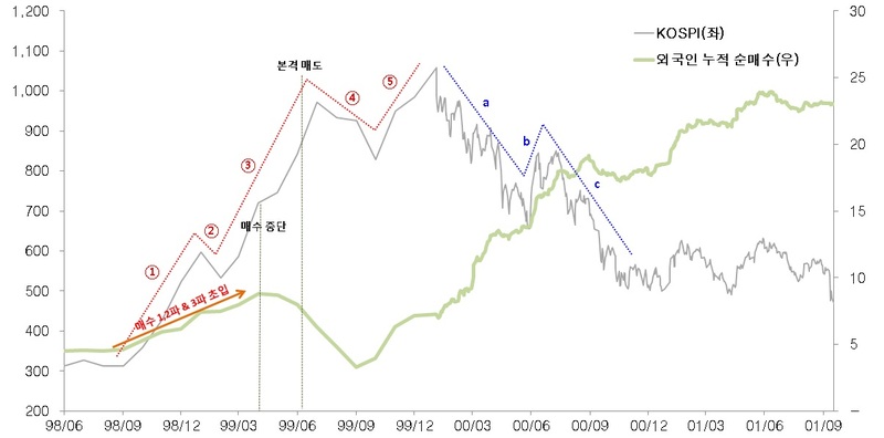 이 세 개의 구간은 하나하나가 다섯 개의 상승 파동과 세 개의 하락 파동으로 구성되어 있으며, 지금 3파가 진행되고 있는 네 번째 파동도 역시 같은 과정을 겪을 것이라고 믿고 있다. 다만, 2번째 구간인 2001~ 2002년 사이클은 너무 짧기도 하고, 분명하게 파동을 구분하기 어려운 것은 사실이나, 편의상 하나의 사이클로 취급했다. 이런 기준으로 보면, 각 구간에서 KOSPI과 관련한 외국인 순매수의 패턴은 몇가지 공통점이 있다.