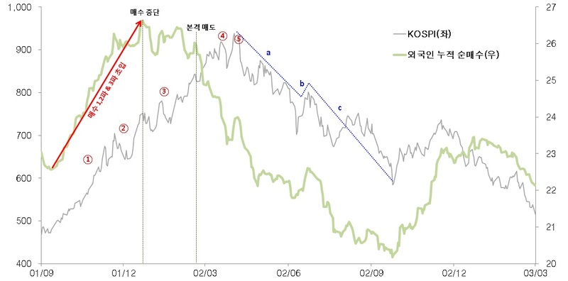 어쨌든 한국 시장은 상승 5파와 하락 3파로 구성된 사이클이 자주 관찰된다는 것이 필자의 논리고, 그 파동과 외국인 순매수 추이는 어떤 관계가 있는지 살펴보고, 시사점을 써 내려가고자 한다.