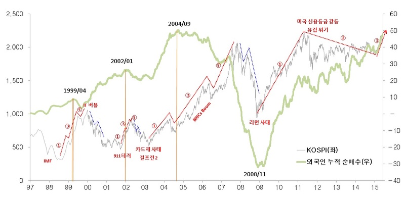 과연 외국인은 위기에 사고, 붐에 파는 역발상의 끝을 보여준 것 아닌가? 다만, 지금 그리스 위기에, 미국 금리 인상, 디플레이션에 대한 걱정과 두려움이 팽배한 지금, 외국인의 매수는 어떻게 해석해야 할까? 생각해 볼만한 문제가 아닌가?
