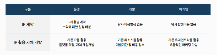 현재 이스트소프트는 중국 업체와 IP계약을 체결했다. 체결된 게임은 카발 웹게임(37), 카발1 모바일(창유), 카발2 모바일(창유). IP계약된 게임은 개발비, 마케팅비가 아예 들지 않는다. 개발과 마케팅을 해당 IP을 계약한 업체에서 개발과 마케팅을 하기 때문이다. 수익구조는 수익의 일정 부분을 배분받는 형태다. 즉 로열티 = 영업이익이 된다(비용X).