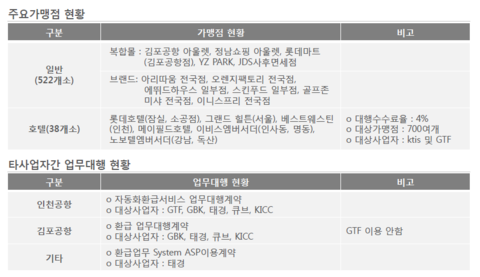 가맹점 비교 : GTF 4,000여개, 글로벌블루 3,000~3,500여개, 케이티스 1,000여개. 총 가맹점은 10,000여개정도로 추산된다.