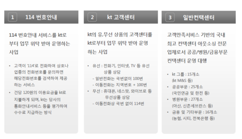 114 번호 안내 서비스와 KT고객센터를 KTCS와 지역별로 나눠서 운용하고 있다. 전체 매출의 70%, 114 번호 안내 서비스는 감소 추세인데, 1Q에 일부 증가한 부분은 수수료 정산 부분에서 일시적으로 반영된 부분이다.