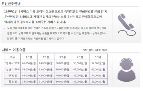 114로 전화해서 ‘대리 운전 전화번호를 알려주세요’, ‘근처 통닭집 알려주세요’라고 물었을 경우, 광고비를 낸 광고주 번호를 우선 안내 해주는 서비스다.