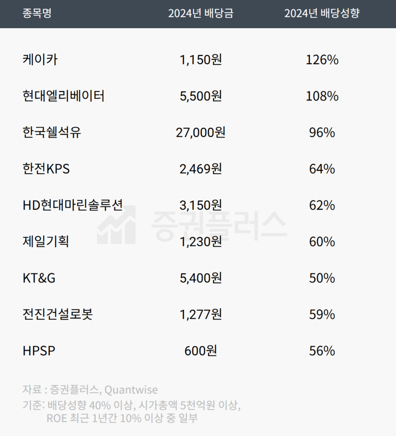 지난해 배당성향이 40% 이상인 기업은 케이카, 현대엘리베이터, 한국쉘석유, 한전KPS, HD현대마린솔루션 등입니다.