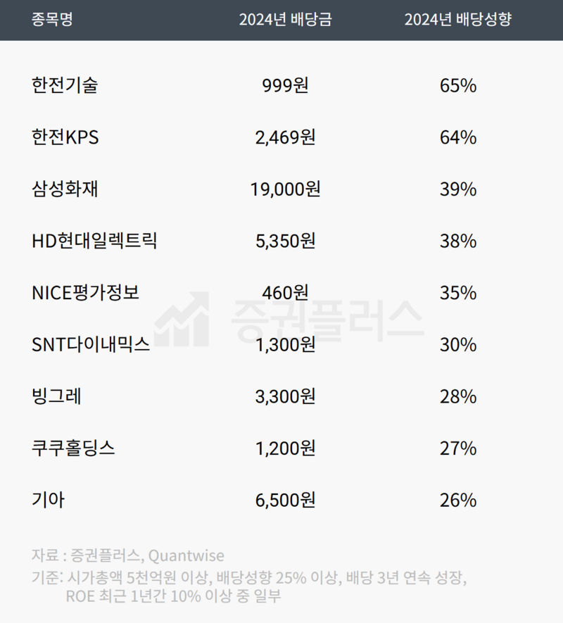 배당성향이 25% 이상, 최근 3년 평균 현금 배당 증가율이 5% 이상인 종목들은 한전기술, 한전KPS, 삼성화재, HD현대일렉트릭, NICE평가정보 등이 있습니다.