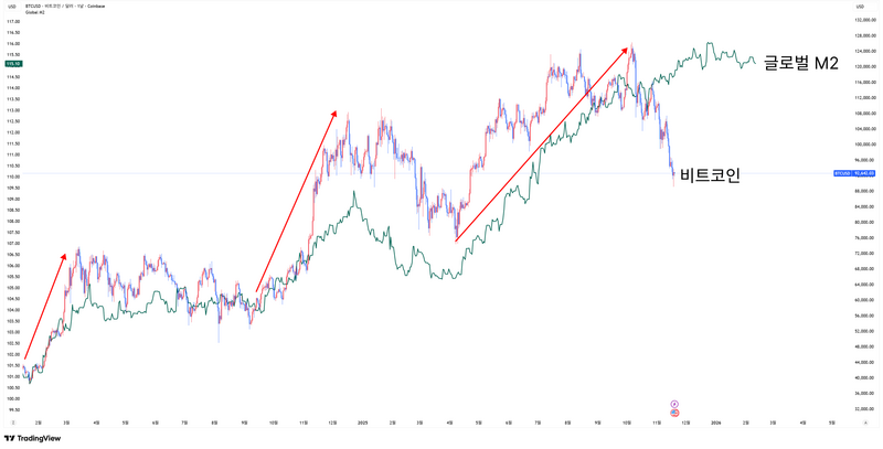 매수를 주장하는 투자자들은 비트코인의 가격 결정 요인 중 가장 강력한 변수로 글로벌 유동성(M2 통화량)의 증가를 꼽습니다.