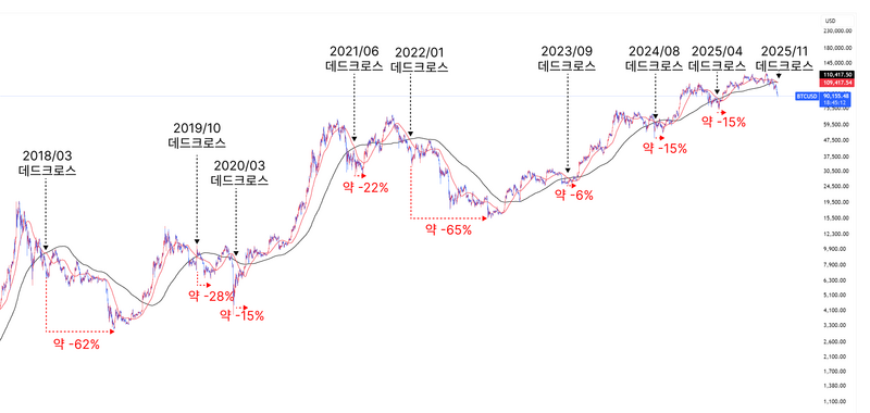 <2018년~2025년 50일-200일 데드크로스 구간 >
