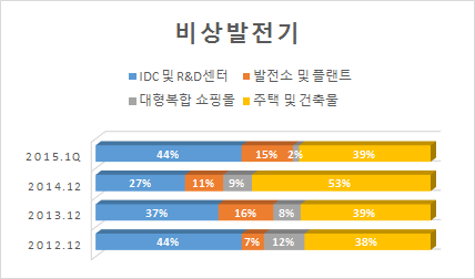 디젤 엔진 비상발전기 부문의 수요는 크게 4가지로 구분할 수 있다. IDC 및 R&D센터, 발전소 및 플랜트, 대형복합 쇼핑몰, 주택 및 건축물이다. 2015년 1분기를 기준으로 IDC 및 R&D센터의 비중이 44%, 발전소 및 플랜트가 15%, 대형복합 쇼핑몰이 2%, 주택 및 건축물이 39%에 달한다.