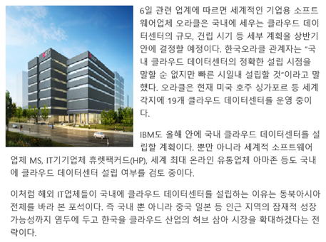 다만 이러한 세계적인 IT기업의 IDC센터 구축 의지는 과거부터 지속적으로 나타났으나 실제 제대로 진행되고 있거나 가시화되고 있는 것은 없으므로 무조건적으로 한국에 IDC센터를 구축한다는 것은 아니고 가능성이 존재한다라는 정도로 받아들일 필요가 있다.