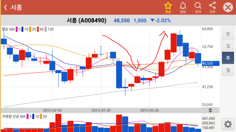 그런데 위의 차트에서 볼 수 있듯이 50,000원이 넘는 주가가 단 일주일만에 40,000원까지 떨어진 사건이 발생했다. 주식에 조금이라도 관심이 있다면 그 사건이 무엇인지 딱 알 수 있을 것이다. 바로 전 국민의 건강에 큰 위해를 끼쳤다고도 할 수 있었던 내츄럴 엔도텍 사건이다. 내츄럴 엔도텍 사건이란 여성의 폐경기에 좋다고 알려진 건강 식품인 백수오 관련 제품이 실제 백수오가 아닌 이엽우피소로 만들어졌다는 것이 밝혀진 사건이다. 이로 인해 건강 기능 식품에 대한 국민의 불신은 깊어져 갔고, 높은 매출 신장을 이루고 있었던 건강 기능 식품 업체가 모두 된서리를 맞았다. 서흥 역시 건강 기능 식품을 일부 팔고 있었기 때문에 일주일 만에 주가가 20%나 하락하게 되었다.