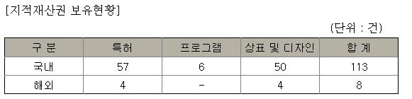 당사의 지적재산권 보유현황이다. 국내외 특허취득은 52건이며, 출원은 100여 건이 넘는다. 또한 캐릭터 산업으로 나아가기 위해서 상표 및 디자인 분야에 대한 특허도 취득하였다. 특허에 대한 세부사항은 다음과 같다.