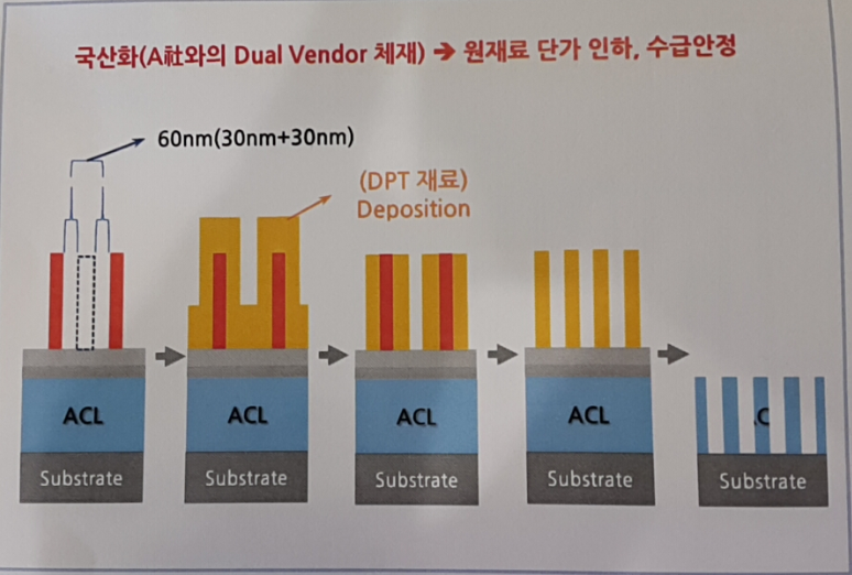 DPT재료는 36나노부터 적용되었고 2012년부터 S사에 납품을 하기 시작하였다. DPT는 미세공정 증가시 급증하는 형태를 지니고 있기 때문에 공정이 점차적으로 복잡해지는 반도체의 추세와 더불어 같이 성장하는 분야라고 볼 수 있다.