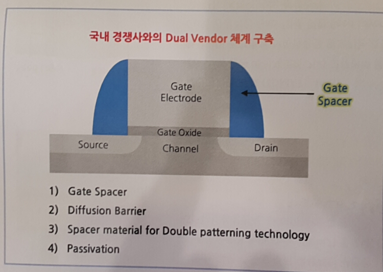 ACL을 대체하여 Hardmask 재료로 사용되며, STP공정에 추가적으로 사용된다. 탄소함유량이 ACL 재료보다는 낮지만 높은 생산성을 지니고 있어 ACL의 대부분을 대체할 수 있다. 회사에서 이를 개발했고 현재 고객사에 납품을 하기 위해 노력 중이다. 만약 납품이 이루어진다면 많은 추가적인 매출 발생 가능성이 크다.