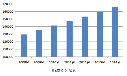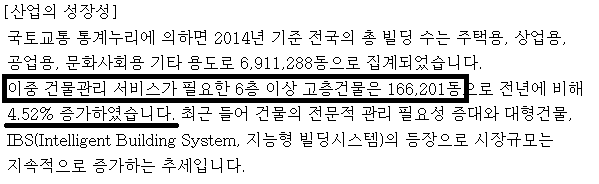 2014년 건물관리 서비스가 필요한 6층 이상 고층건물은 166,201동으로 전년에 비해 4.52% 증가하였다고 사업 보고서에 명시되어 있다. 건축행정시스템인 '세움터'에서 2008년~2014년 통계자료를 찾아 본 결과로 매년 꾸준한 성장세를 지속중이다.