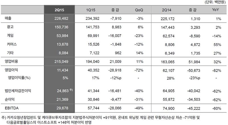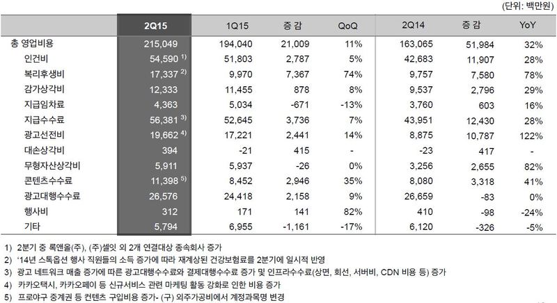 다음으로는 영업비용과 영업이익에 대해서 살펴보겠습니다. 2분기 영업비용은 전분기대비 210억 원 증가, 전년 동기대비 520억 증가한 2,150억 원을 기록했습니다. 주요 비용 항목을 살펴보면, 인건비는 록앤롤, 셀잇 등 연결 대상 종속 회사가 추가된 결과로 전분기대비 28억 원, 전년 동기 대비 119억 증가한 518억 원을 기록했습니다. 복리 후생비는 2014년 스톡옵션을 행사한 직원들의 소득 증가에 따라 재계상된 건강 보험료가 2분기에 일시적으로 반영되면서 전 분대비 74억 원, 전년 동기대비 76억 원 증가한 173억 원을 기록했습니다. 광고 선전비는 카카오 택시, 카카오 페이 등 신규서비스에 대한 마케팅 활동 증가로 전분기대비 24억 원, 전년 동기대비 108억 원 증가한 197억 원을 기록했습니다. 콘텐츠 수수료는 프로야구 중계권 등 콘텐츠 구입 비용 증가로 전분기대비 29억 원 증가, 전년 동기대비 33억 원 증가한 114억을 기록했습니다. 참고로 외주 가공비가 이번 분기부터 콘텐츠 수수료로 계정명이 변경되었습니다. 결과적으로 2분기 영업이익은 전분기대비 71.7% 감소, 전년 동기대비 81.6% 감소한 114억원을 기록했으며, 영업이익률은 5%입니다.